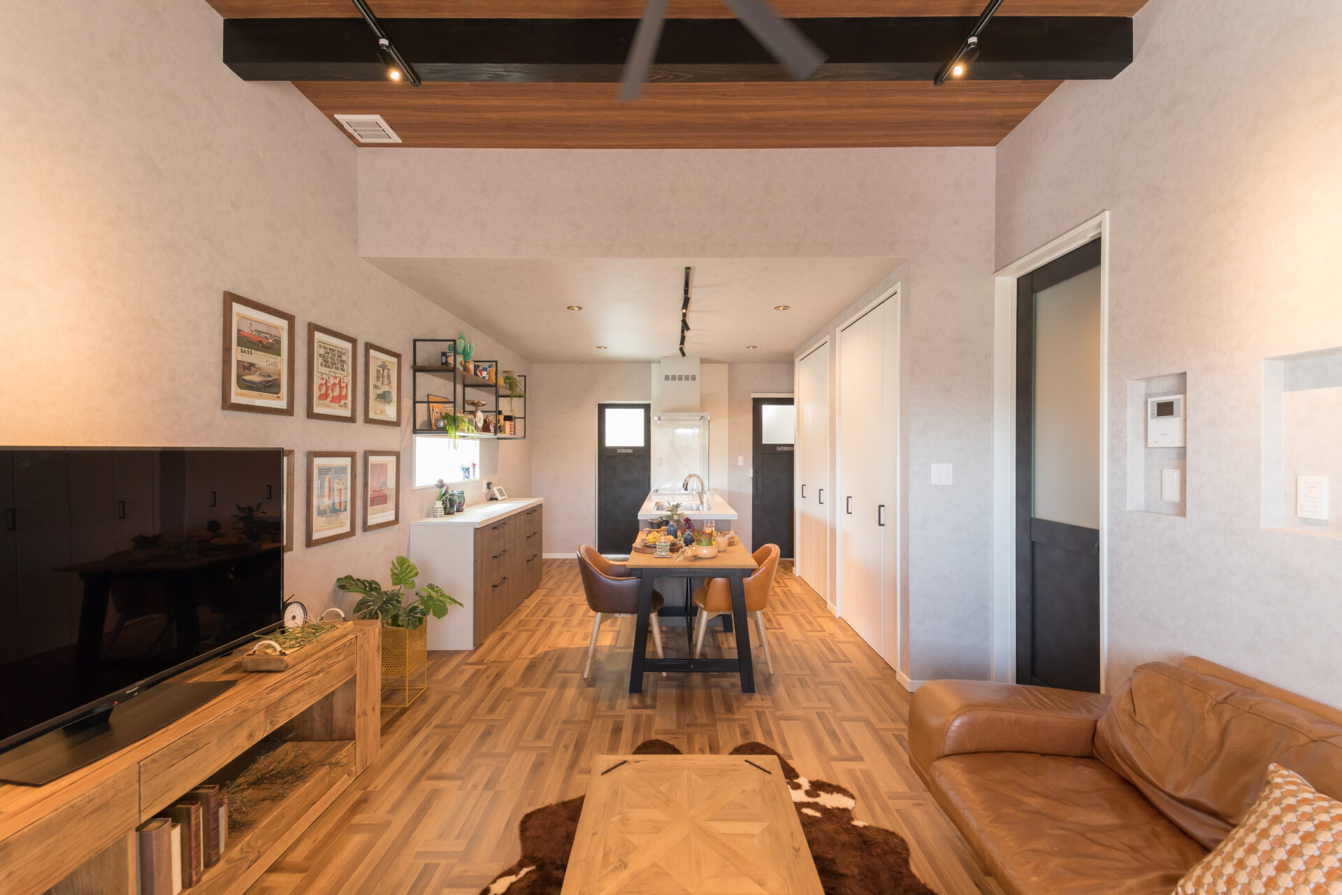 木目とカジュアルなアメカジテイストのインテリアでまとめたガレージ付きモデルハウス。 遊びゴコロのある仕様でお家で過ごす時間をより一層特別な時間に。 天候に左右されないガレージで趣味の時間に没頭することもできます。